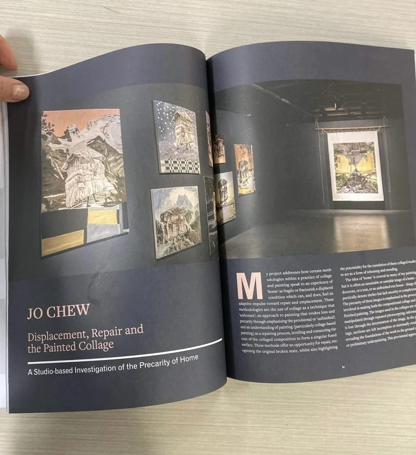 Jo Chew’s walking house series (ongoing) responds to experiences of displacement. Across the paintings, a figure carries a portable home over challenging terrain, inspired by the story of Liu Lingchao, the ‘Snail Man’. Lingchao gained attention for his portable house made from bamboo poles and plastic sheets. He carried the house on his back during three-day trips from his hometown Guangxi to the capital city Liuzhou, where he collected rubbish to sell for recycling. Drawing on this story, Jo explores the vulnerability of displacement but retains a sense of hope— she contemplates ‘home’ as a practice we carry instead of a physical place. The artist’s optimism is extended through process. Jo bases her paintings on small collage studies, whereby ‘exiled’ fragments are brought together into the ‘new home’ of the overall composition.